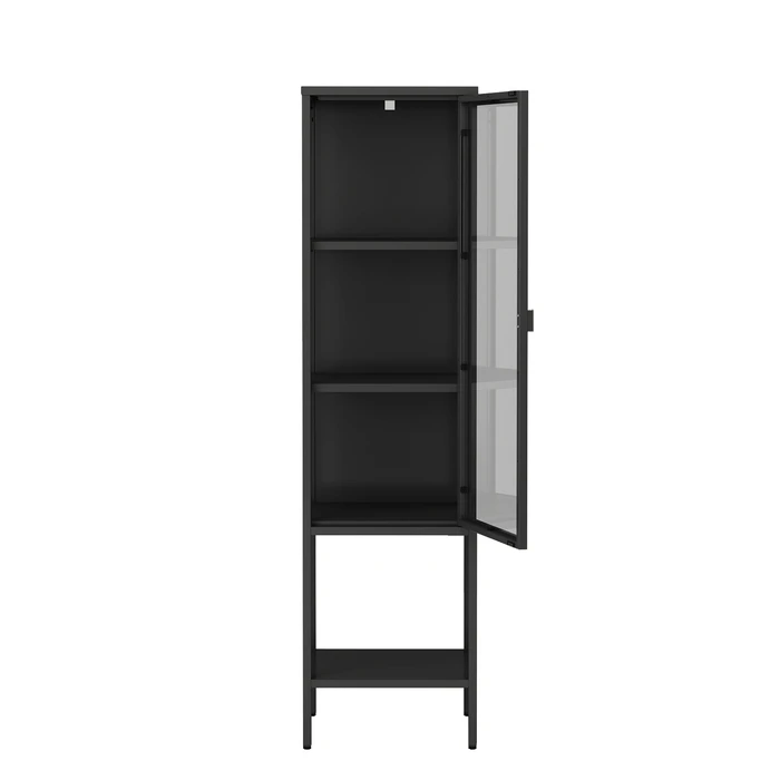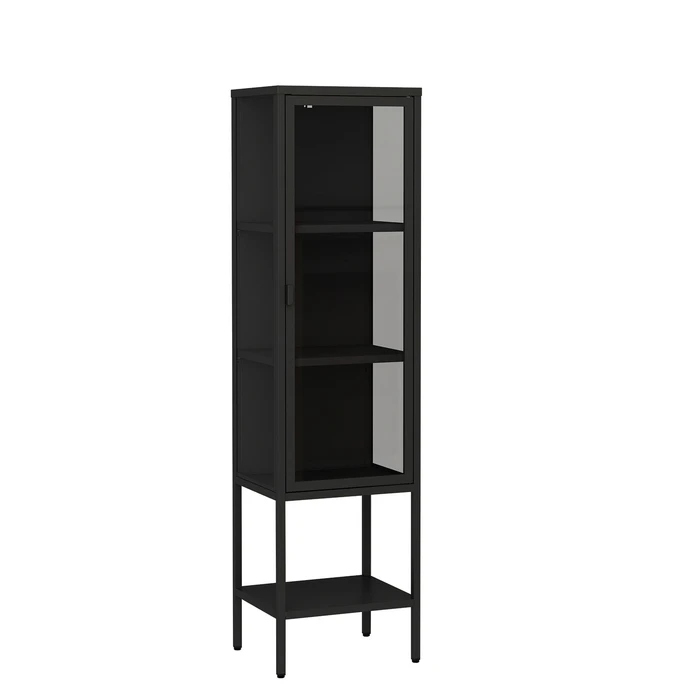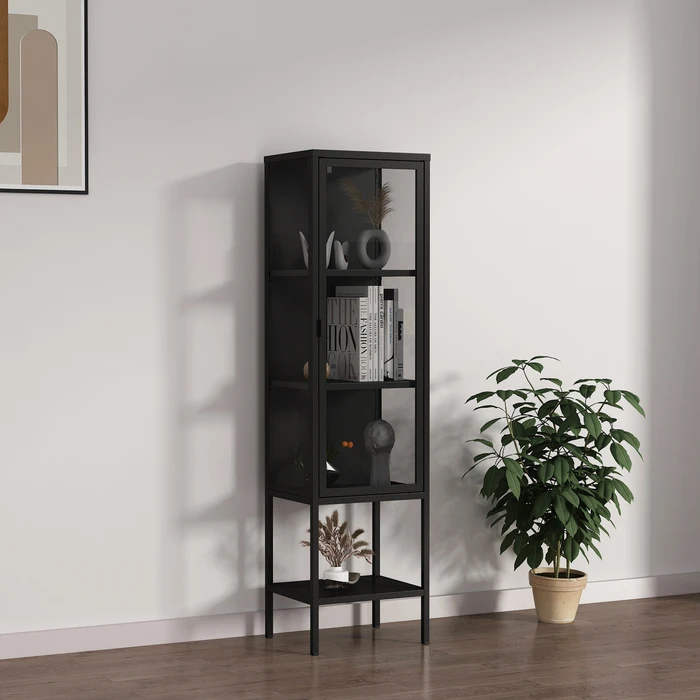 ויטרינה מתכת עם דלתות זכוכית בפשטות מדויקת, ונוכחות עוצמתית.